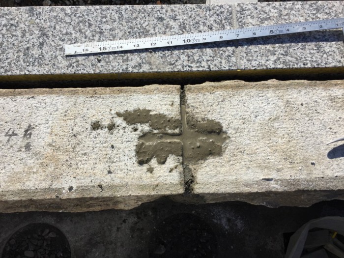 据付方法も接着剤は不適なので、従前のモルタル工法になります。でも、少しでも補強をするためにこんなふうに石に穴をあけて『カスガイ』を入れます。モルタルにも混入タイプの接着剤を入れての施工です。