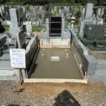 一応、墓誌台(白い石)の下には、前述の要領で叩き込んだ受け石が2つ入っています。その上でのモルタル施工。受け石以外の墓誌台下部にもモルタルを入れて据付けてあります。