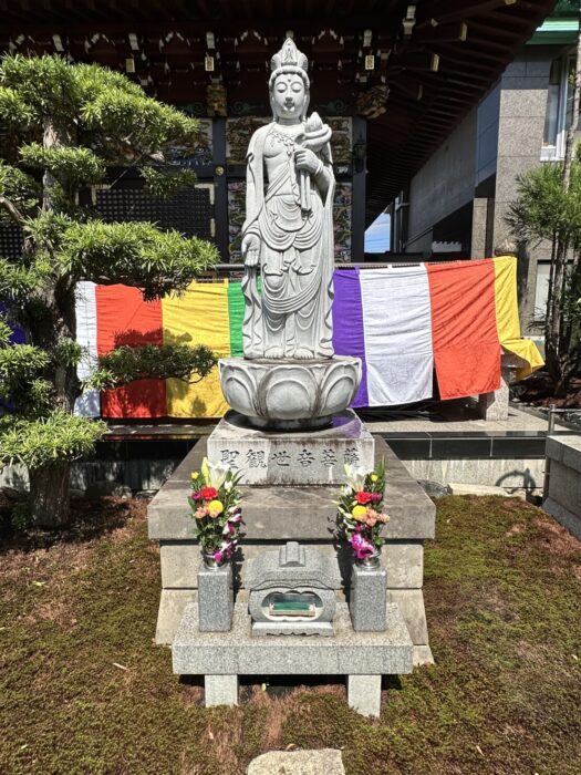 本堂前には、以前に吉澤家の先祖供養を願って建てさせていただいた聖観音像もあり、父と私の名前が刻んであります。そこにも忘れずにお花とお線香を。毎回、この観音さまの前で手を合わせると、どこかホッとするような気持ちになります。