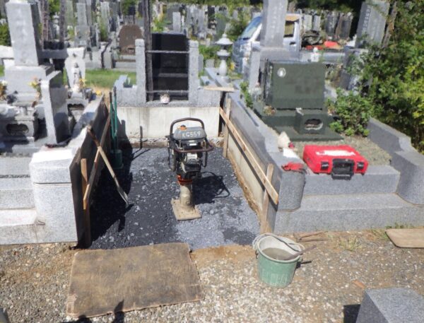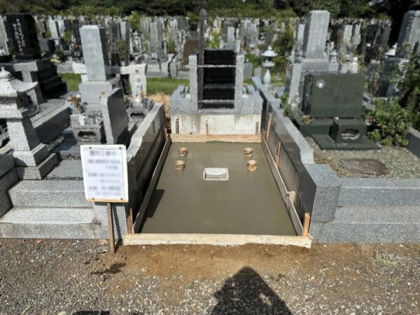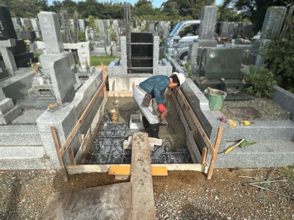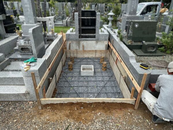 コンクリート打設後の養生期間は、1㎡墓所の時と同様です。建築物では28日養生が基準ですが、お墓は静加重ですから7〜10日程度で十分な強度が得られます。