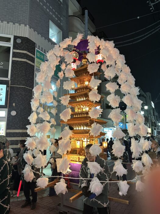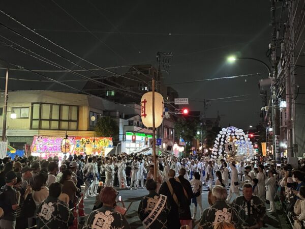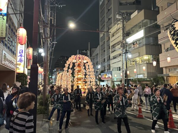 池上駅前通りから本門寺へ向かう道は、人と光と音で埋まります。登戸結社の万灯は、沿道から声が上がるほど立派で大きい。それを引いて街中を練り歩きます。