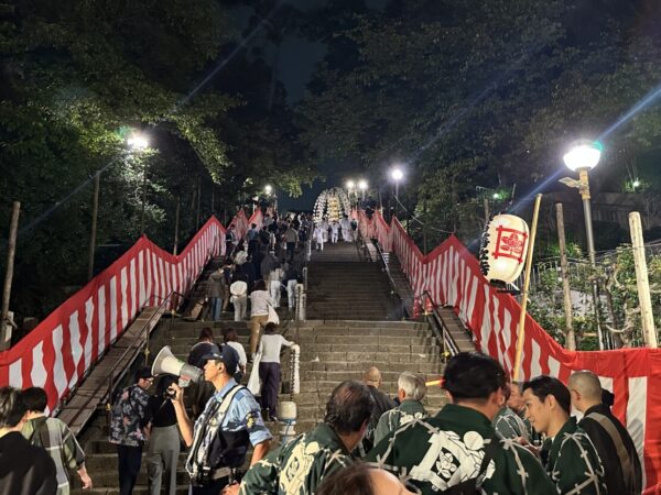 96段の急な階段を、重い万灯を持ち上げて登る。仲間同士で掛け声を合わせ、慎重に、一歩ずつ。落としたら大変なことになりますから、石段の下に立つと、毎年緊張します。