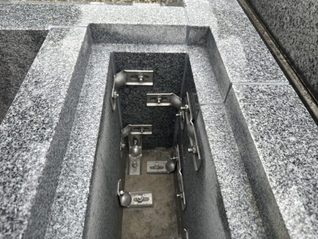 根石と納骨室の間の、隠れるスペースにはステンレス製金具で緊結して補強します(写真①・②)。