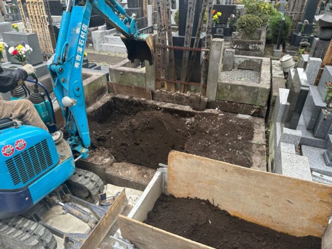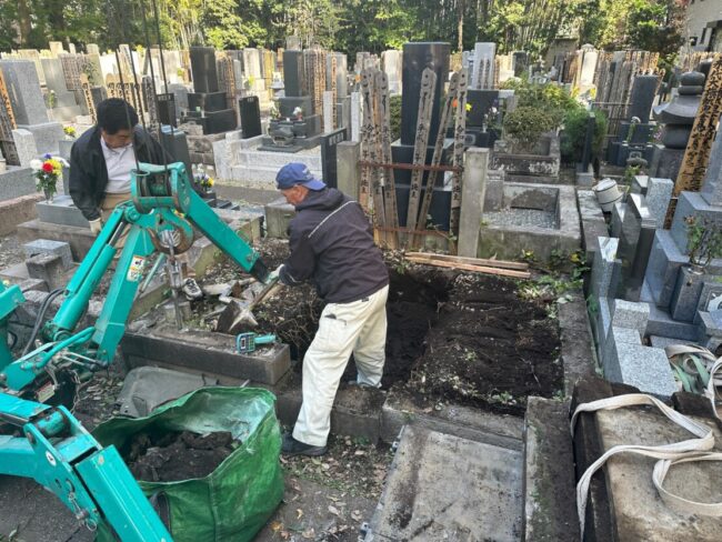 寺院墓地という立地上、狭い区画のため、小型バックホーとカニクレーンを