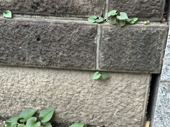 目地の間からドクダミが。すき間ができている証拠です。