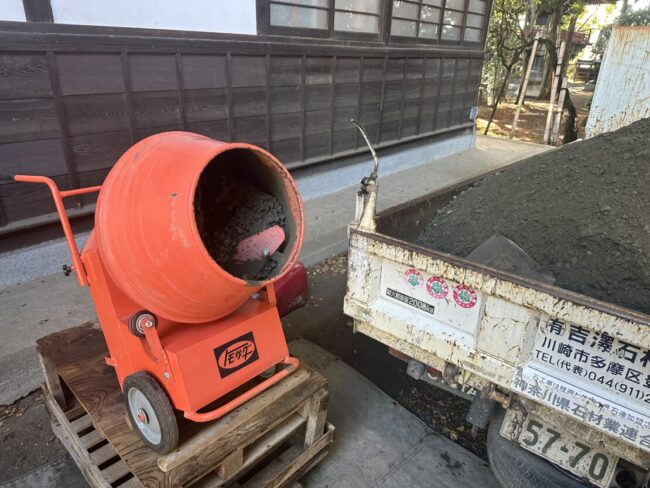 現場ミキサーにから練りコンクリートを投入し、少しずつ水を加えながら練っていきます。