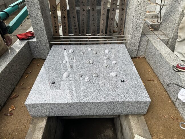 新調した芝台(しばだい)。納骨室の屋根と石塔の土台を兼ねる石です