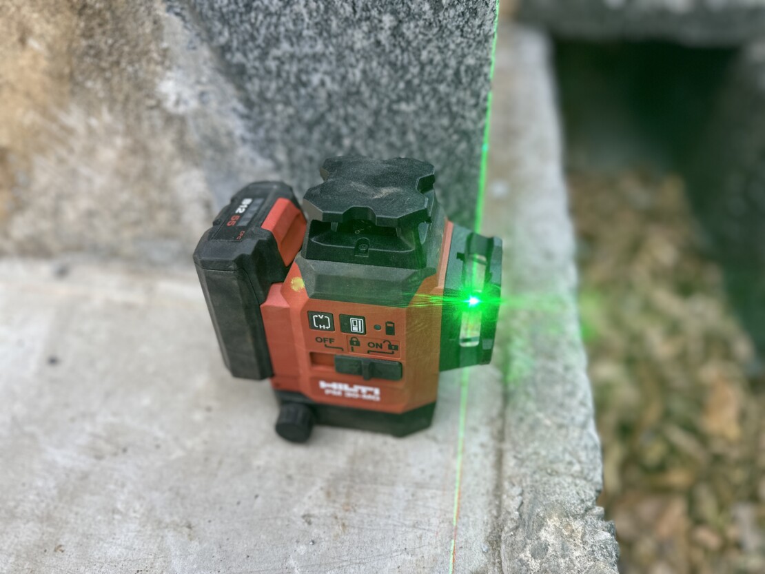 レーザーの大矩。緑のレーザー光線で正確に直角を出していく